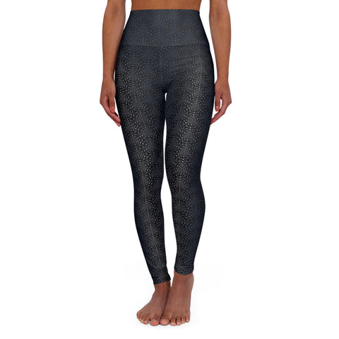 High waisted yoga leggings featuring a hexagonal geometry colored in moonlight tones. These leggings give off a calming and serene vibe, perfect for yoga sessions or casual wear. Ideal for yoga enthusiasts, moon lovers, and individuals looking for unique activewear. Relevant for yoga classes, full moon celebrations, and comfortable everyday wear.